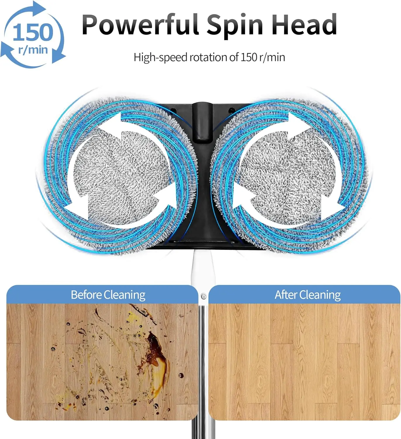 The AlfaBot WS-24 cordless electric mop is designed for efficient floor cleaning. Featuring dual-spin heads at 150r/min, it tackles tough stains with ease. Its cordless design, 2000mAh rechargeable battery, and lightweight build make it ideal for cleaning up to 2000 sq. ft. per charge. With adjustable height, LED headlights, and a built-in water spray tank, it’s ideal for reaching under furniture and into corners.